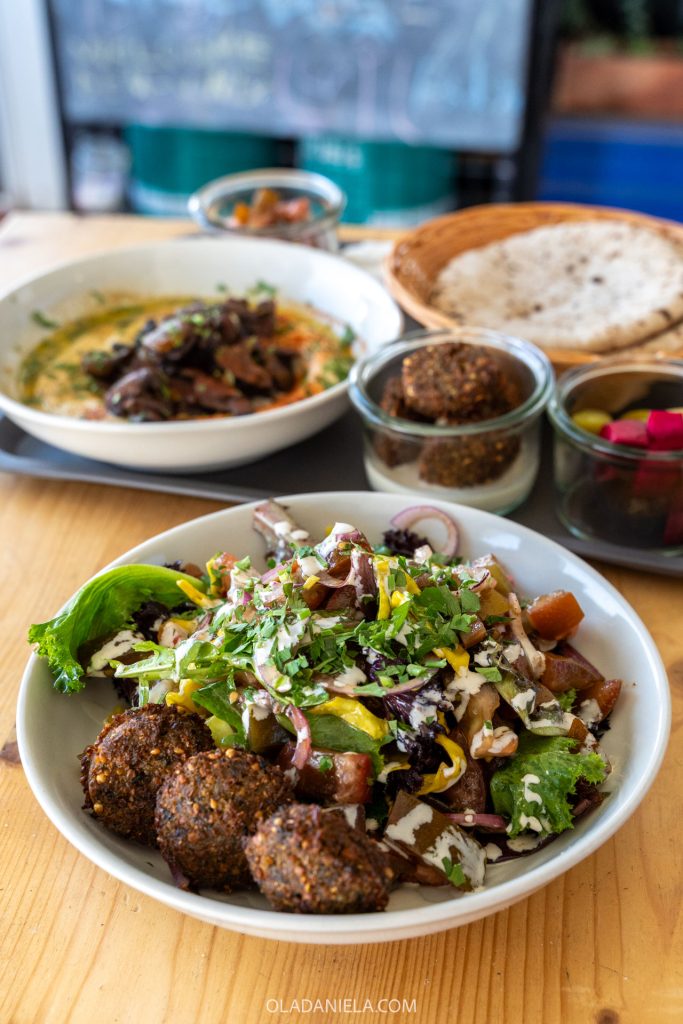 Another good spot for lunch for vegetarians is The Hummus Kitchen, a family-run Middle Eastern restaurant focused on everyone’s favourite chickpea dip. The salad here, with made-to-order homemade falafel, is unreal. We shared that with a hummus plate that arrived loaded with mushrooms, housemade pickles, flatbread and a little tomato salad.