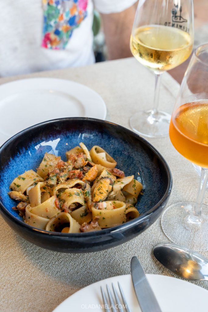 We opted for the melon and cucumber summer gazpacho, the raw fish plate (something we’d tried in Puglia years ago), and the seafood pasta calamarata.